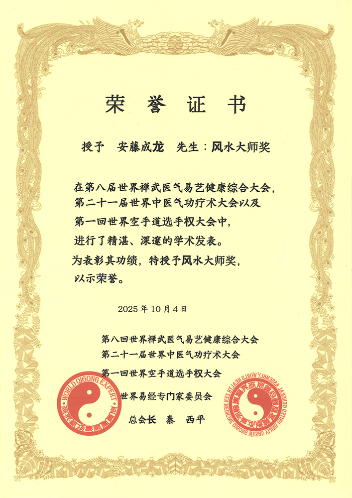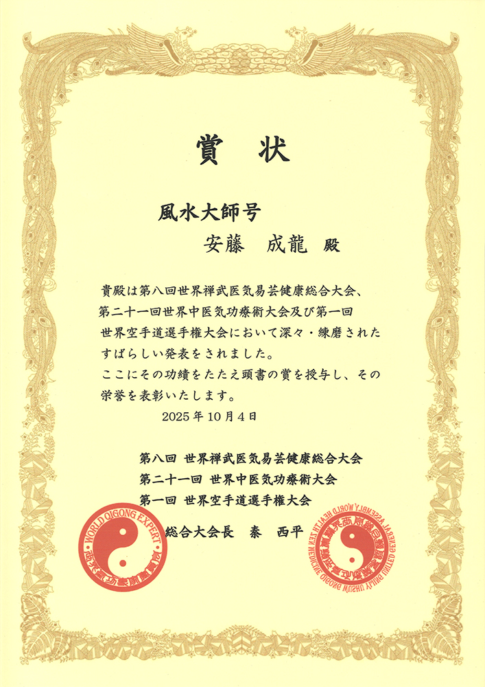第8回世界禅武医気易芸健康総合大会 2025年10月4日㈯、5日㈰の両日、東京の国立オリンピック青少年センターに内外の名手が集まり、技を競いました。今回は、現代風水研究会による特別セッションを行ない、それぞれが名誉ある賞を受賞しました。